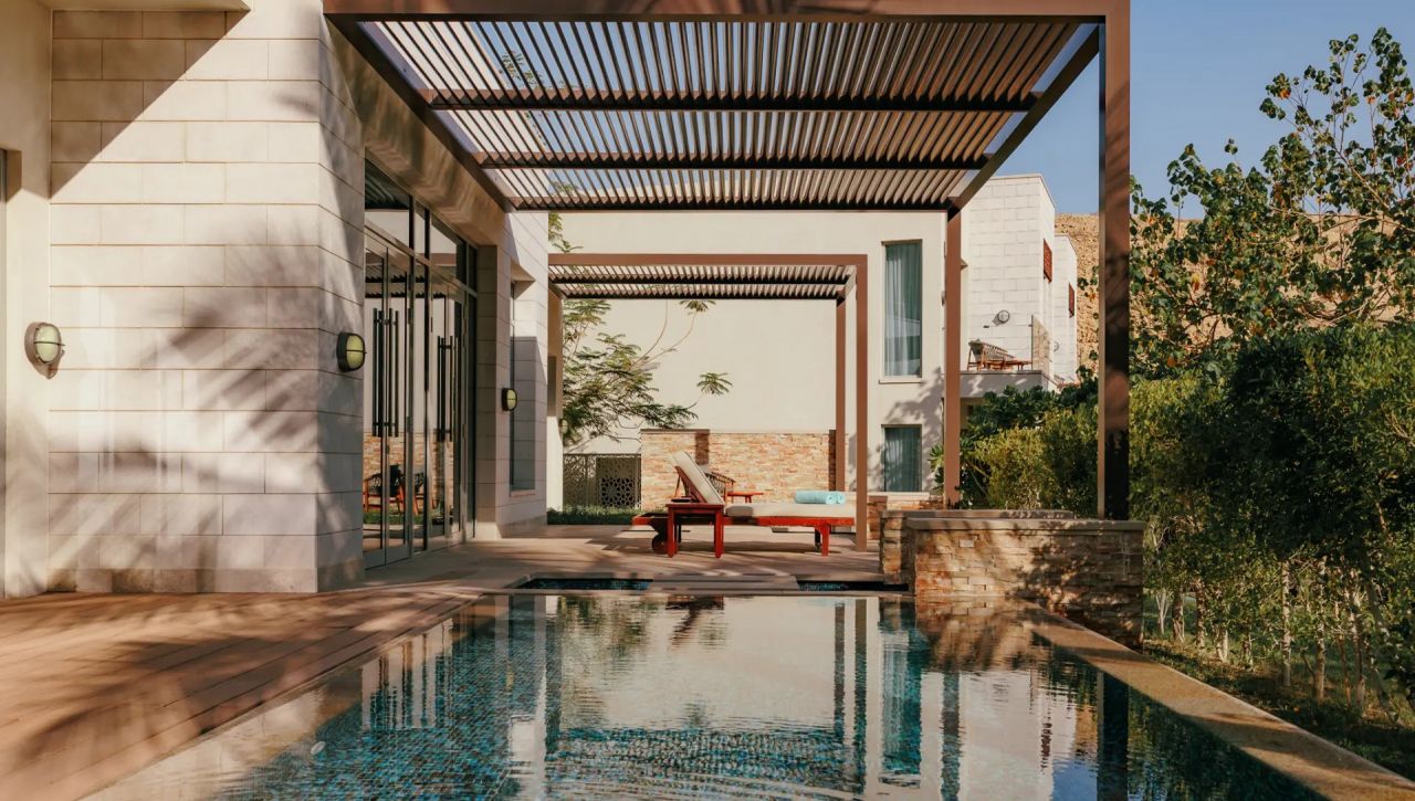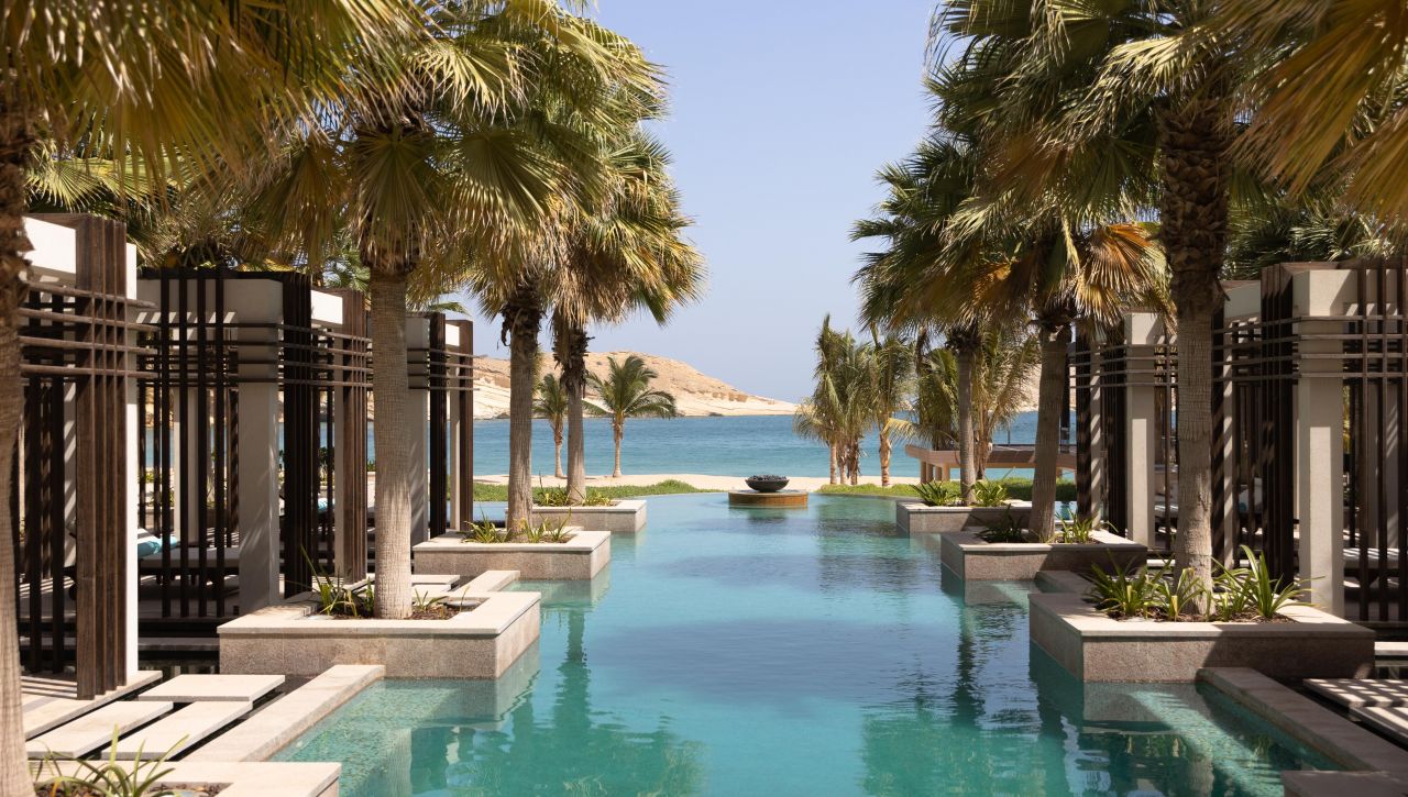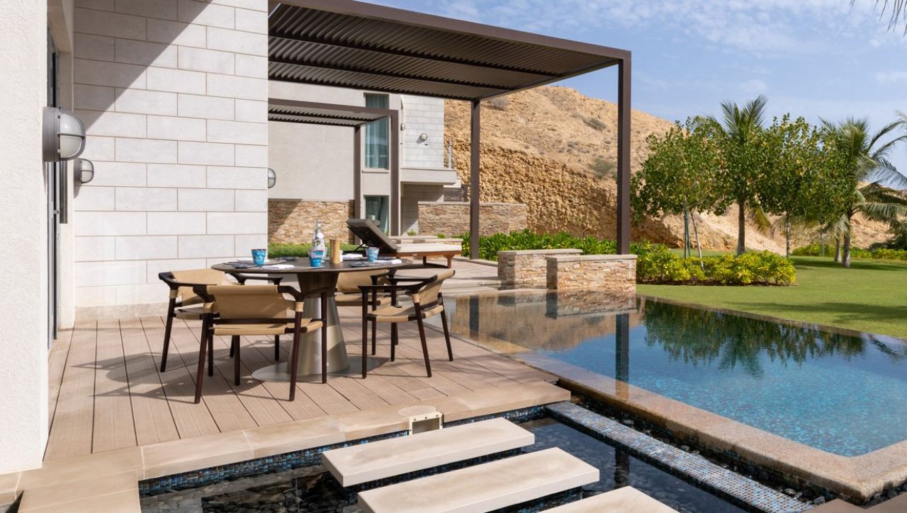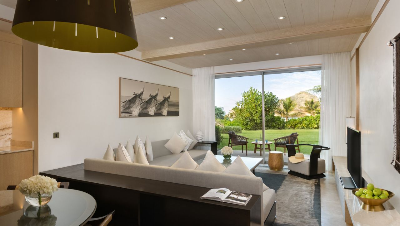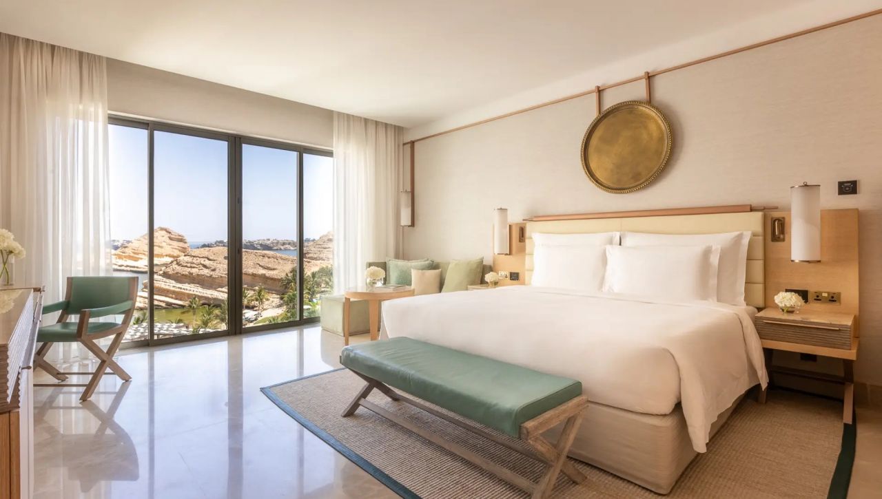 Pokoje, suity a rezidence jsou navrženy tak, aby zachytily to nejlepší z ománské přírody. Velká panoramatická okna otevírají výhledy na moře nebo horské masivy, interiéry propojují světlé tóny, přírodní dřevo a jemné textilie, které vytvářejí prostředí, jež je klidné, vzdušné a sofistikované. Suity disponují velkorysými terasami, privátními lounge prostory a koupelnami orientovanými tak, aby hosté mohli relaxovat s výhledem na západ slunce nebo hladinu moře.