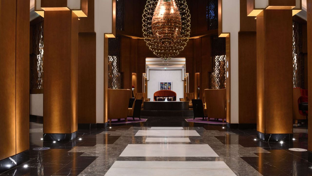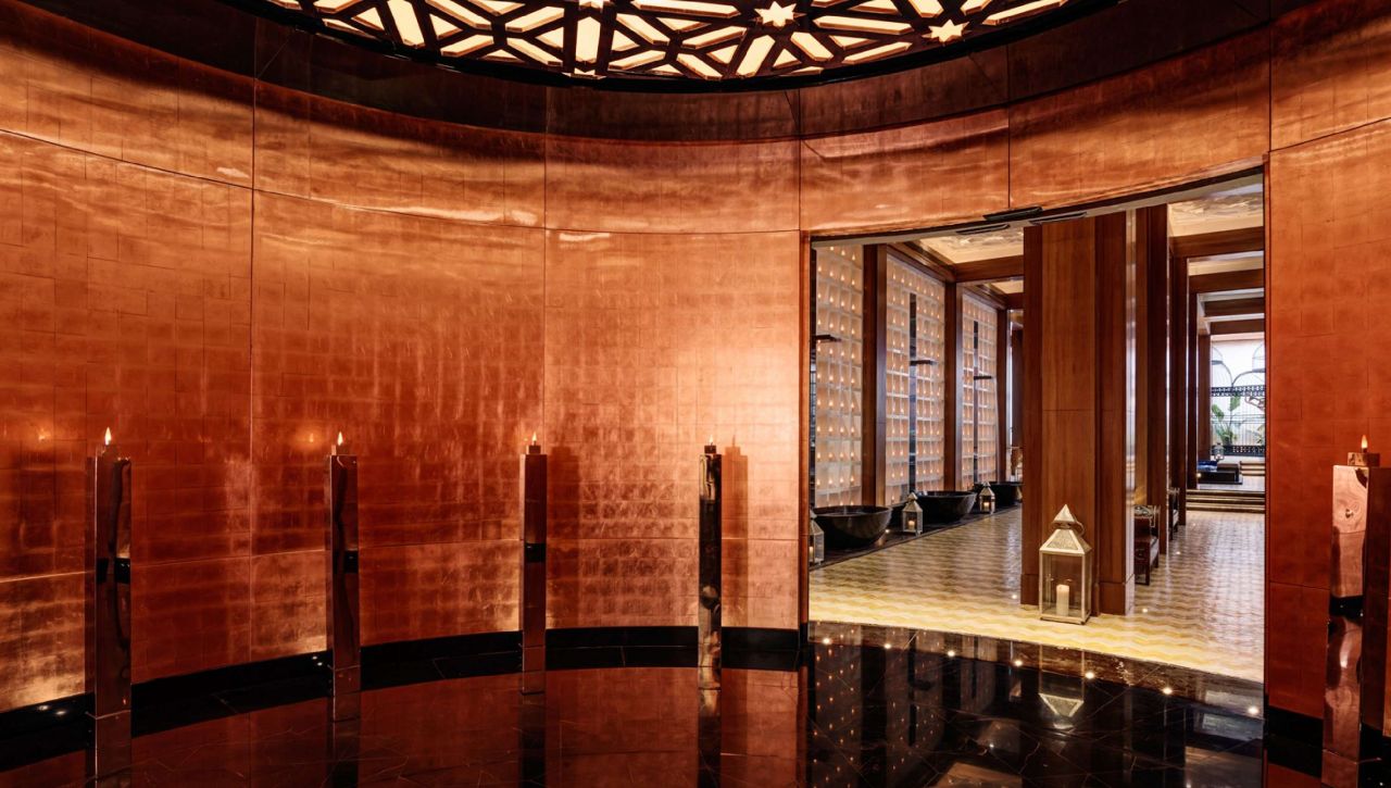 Design hotelu citlivě propojuje moderní eleganci se symbolikou tradiční marocké architektury. Vysoké oblouky, ornamentální stropy, mozaikové vzory a měkké světlo vytvářejí atmosféru, která vás okamžitě pohltí. Interiéry hrají teplými tóny písku, bronzu a modrého kobaltu, připomínajícími barvy saharské krajiny i staré mediny.